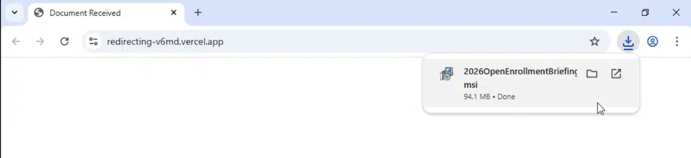 3:14:42 PM - (16 seconds later), malicious file "2026OpenEnrollmentBriefing.msi" downloaded (94.1 MB actual / 4.19 MB compressed)