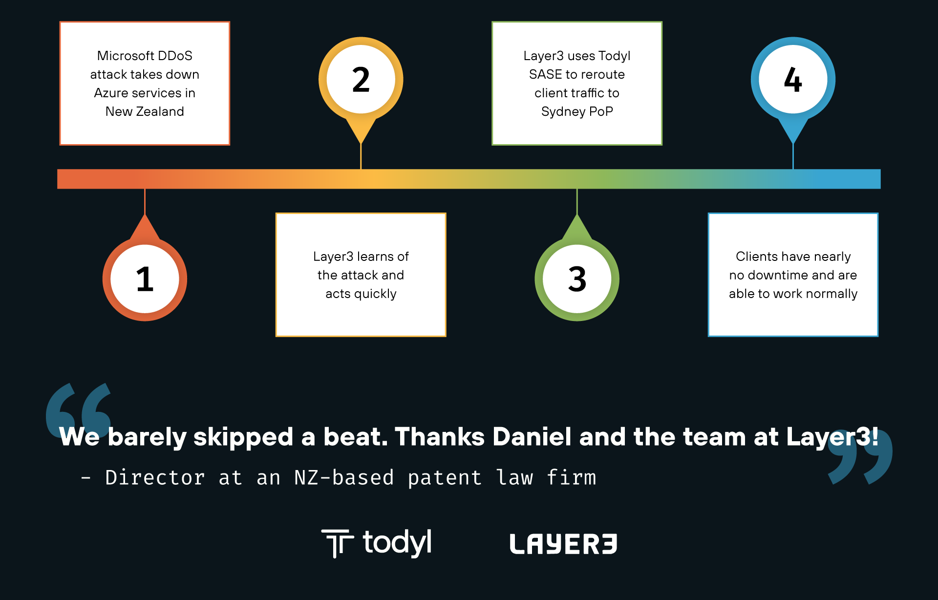 Thanks to their fast response and ability to maintain secure connections through SASE, Layer3 kept their clients connected to the resources they needed to maintain business velocity. From their clients’ perspective, the outage was hardly a blip. One client, a Director at an NZ-based patent law firm, had this to say: "We barely skipped a beat. Thanks Daniel and the team at Layer3!"