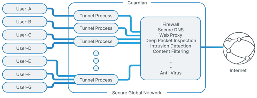 With our goals set, we needed to first understand how far we could push our prior technology that handles connections from devices to the SGN. This technology is a critical component, serving to create a secure tunnel between the user’s device and the SGN while providing three critical functions: authentication, encryption, and routing. Every single data packet protected by the SGN is processed here, making it a key part of the performance equation. We had to minimize latency and maximize throughput to achieve our goal.