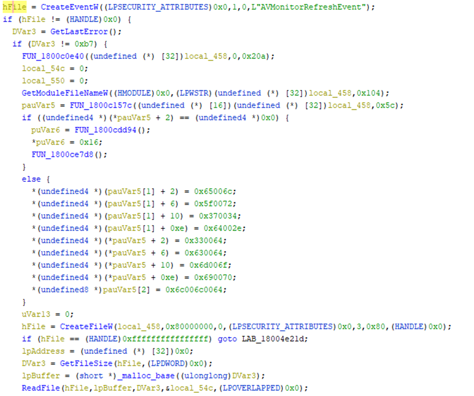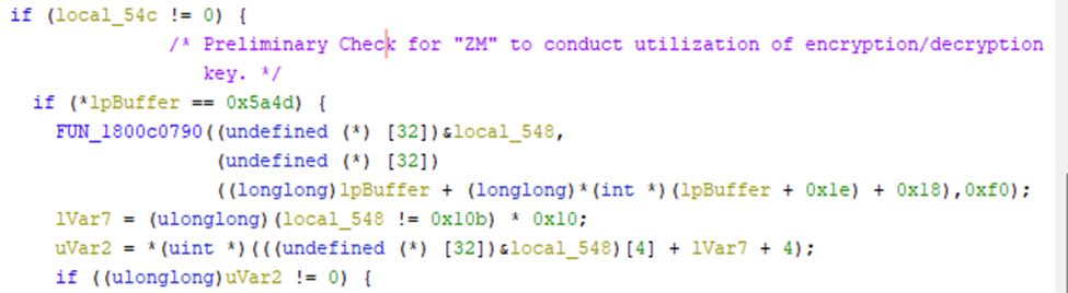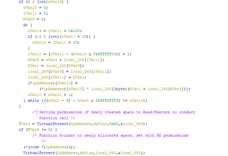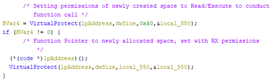 The screen shot above shows that the loader reads in the contents and utilizes the Decrypt function shown previously. There’s also a comment that mentions how you should utilize the shellcode execution, which can be seen in the screenshot from Ghidra below: