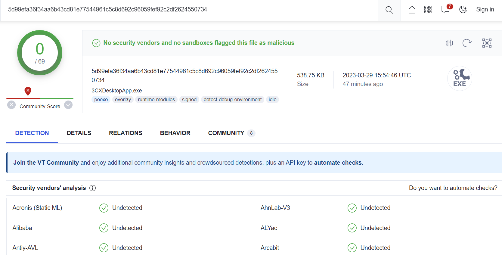 As of writing, all identified malicious domains and repositories have been taken down and many endpoint security providers have implemented detection and prevention mechanisms. 3CX acknowledged the issue, engaged Mandiant, and is working towards releasing a clean version of the software.