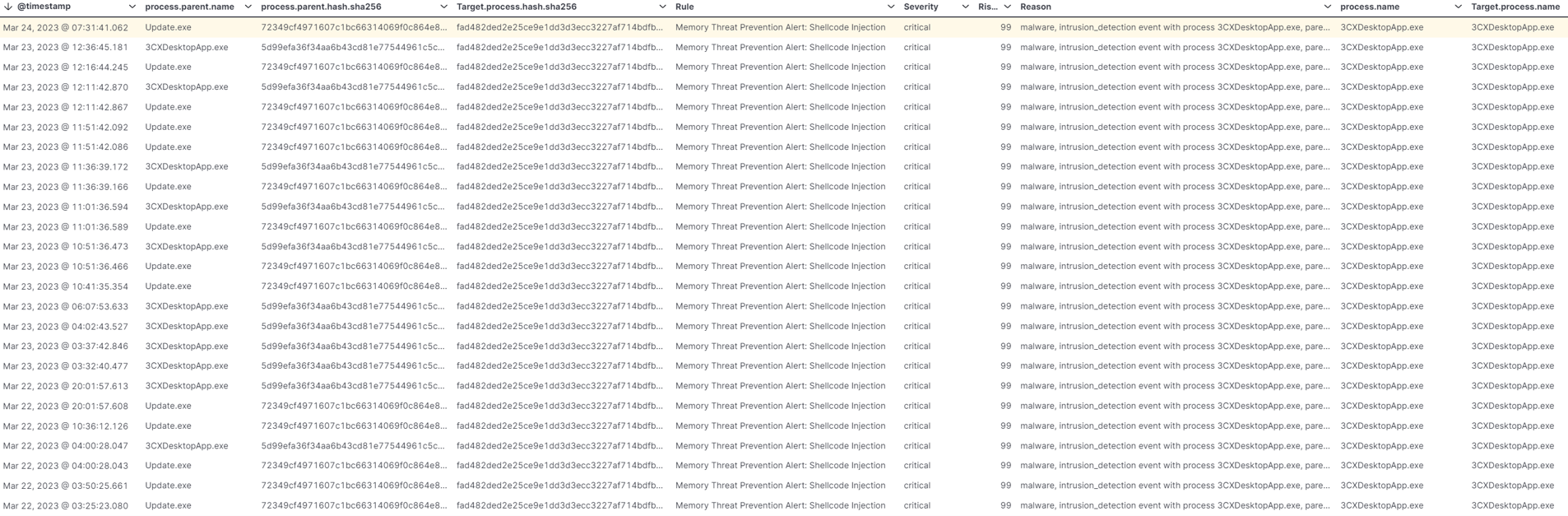 On March 22nd at 3:25AM MT, Todyl’s Endpoint Security module’s memory threat prevention blocked a hash from the Update[.]exe binary. From there, we saw numerous additional alerts for hashes in both the update process and app (3CXDesktopApp[.]exe), all of which were indicators of shellcode injections into the app process. The process parent hashes include: