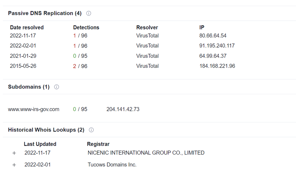 The threat actor re-registered the domain name www-irs-gov[.]com on 11-17-2022. The domain appears to have been registered and re-registered with several registrars since 2015: