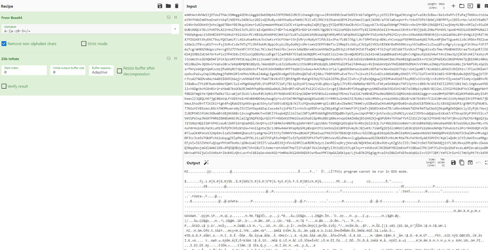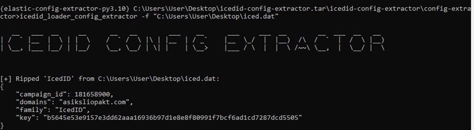 After decompressing the bytes, we can see the MZ header that indicates the PE file type. We then saved the decompressed file as iced.dat and ran it through Elastic's IcedID extractor tool [3].