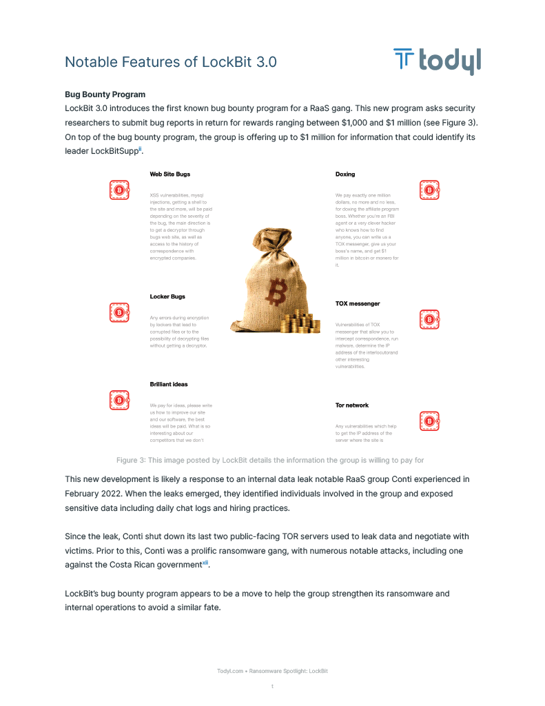 LockBit announced its latest 3.0 version in late June 2022, which includes a few key updates that signal the group’s emphasis on operational security (OPSEC), highlighting the program’s maturity as a criminal enterprise. One notable update is the new bug bounty program, which promises to pay as much as $1 million USD for discovering any vulnerabilities or information that may lead to the identification of the group’s leader who uses the moniker LockBitSupp.